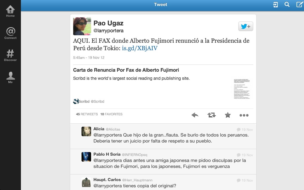 Además, revela que el candidato a la presidencia por Perú Posible, junto a Diego García Sayán, son la conexión en el Perú para lograr este objetivo. Según él, a Alejandro Toledo le pasará lo que al papel higiénico: después de usarlo, lo desechan.